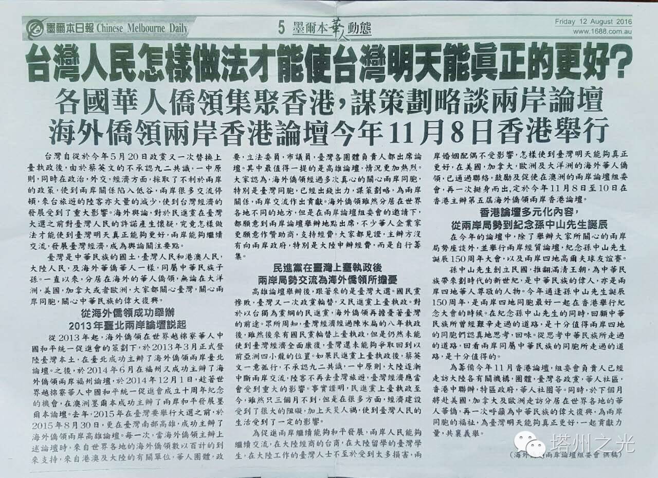 台湾人民怎样做才能使台湾明天能更好? 各国华人侨领集聚香港,谋策划略谈两岸论坛,海外侨领两岸香港论坛今年11月6日香港举行 墨尔本日报 2016年8月12日